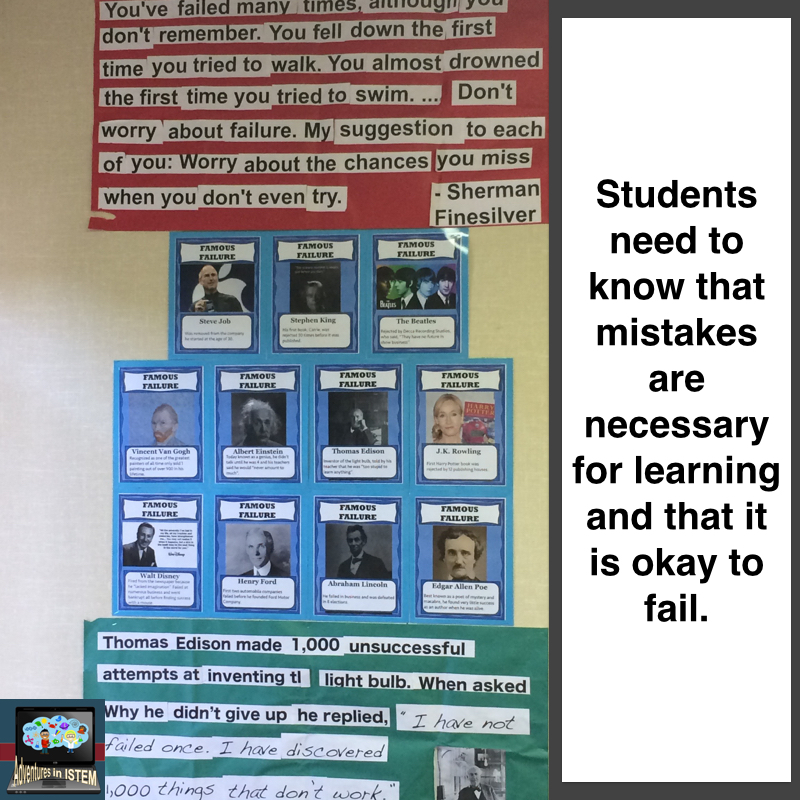 As they enter my room the first thing they see is my famous failures wall. I want them to know that mistakes are necessary for learning and that it is okay to fail. I try and stress throughout the year that everyone that has been successful has failed. I allow my students to try over and over again and encourage them to be risk takers. My students know that they won’t be penalized the first few times they are trying out new things because failing is part of the learning process.